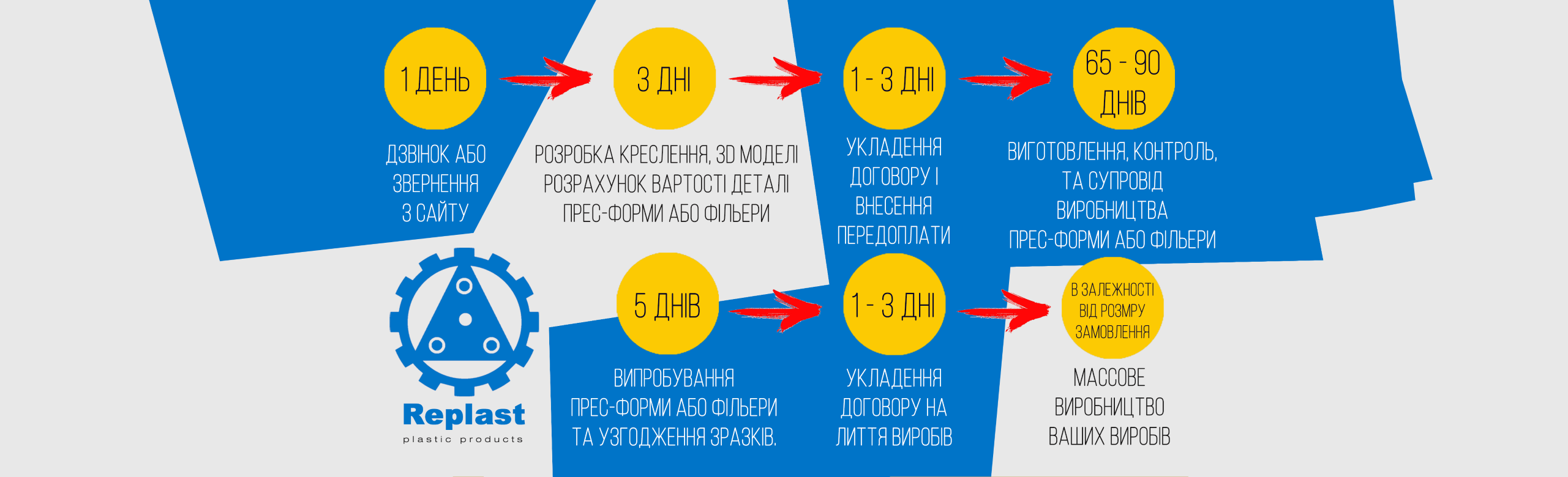 - 65-90 днів. Виготовлення, контроль, та супровід виробництва прес-форми або фільєри.